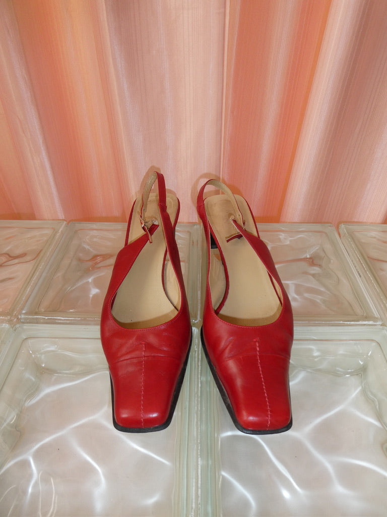 Vintage red leather 90s square toe sling back kitten heels.