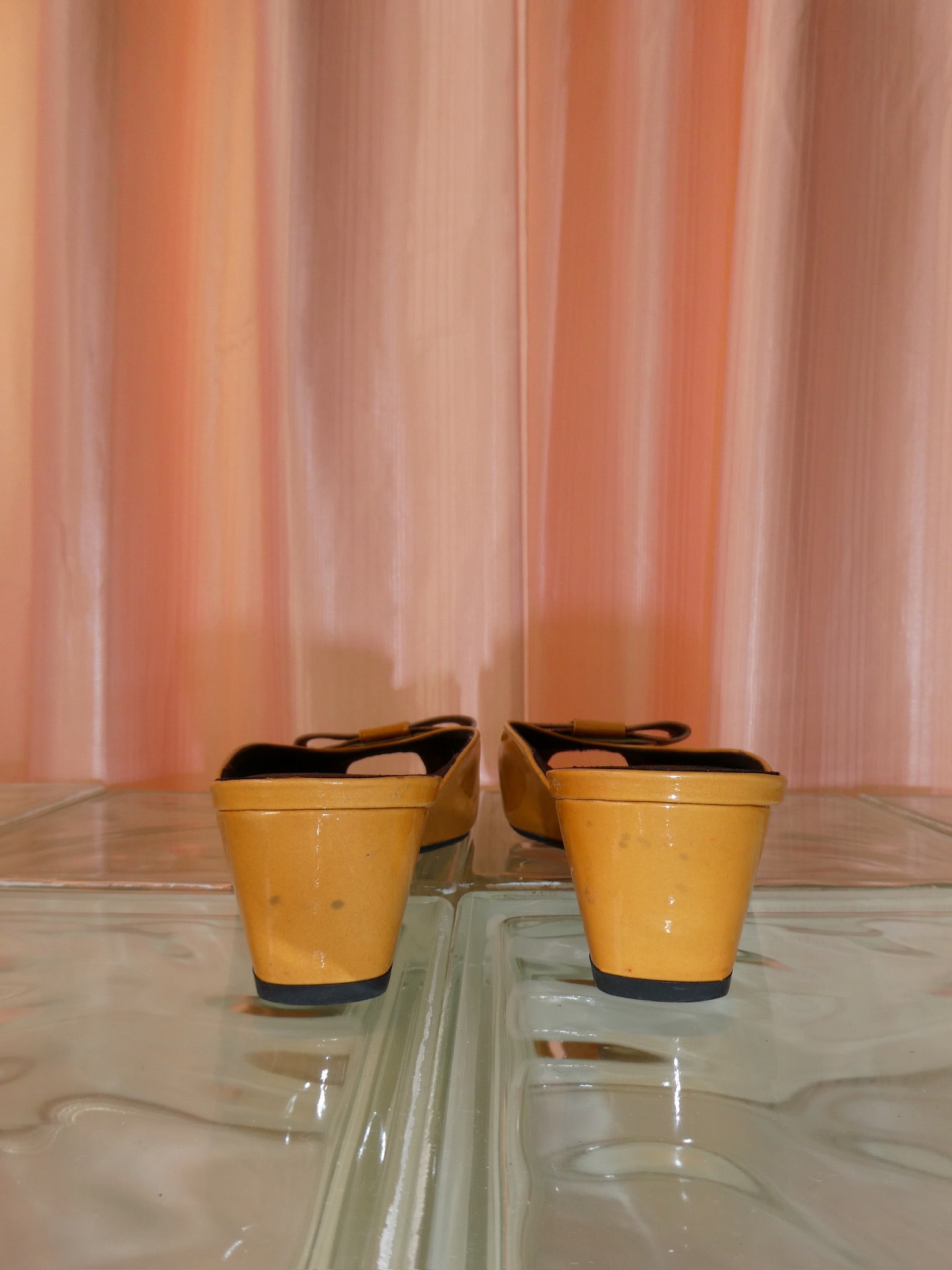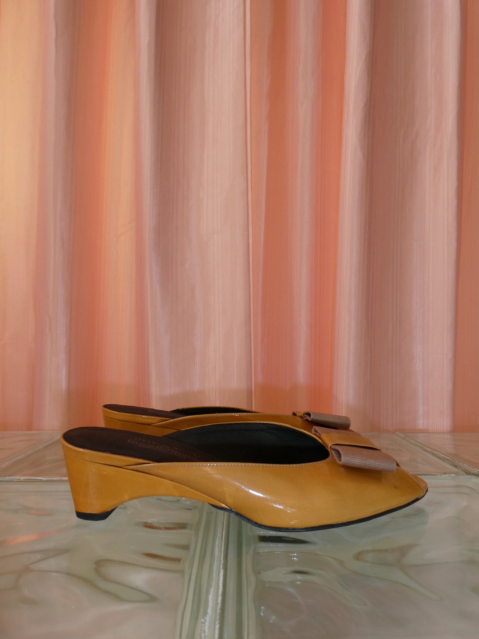 Very Rare Vintage Stuart Weitzman for Russel & Bromley tan patent leather kitten mules with beige bow and peep toe.