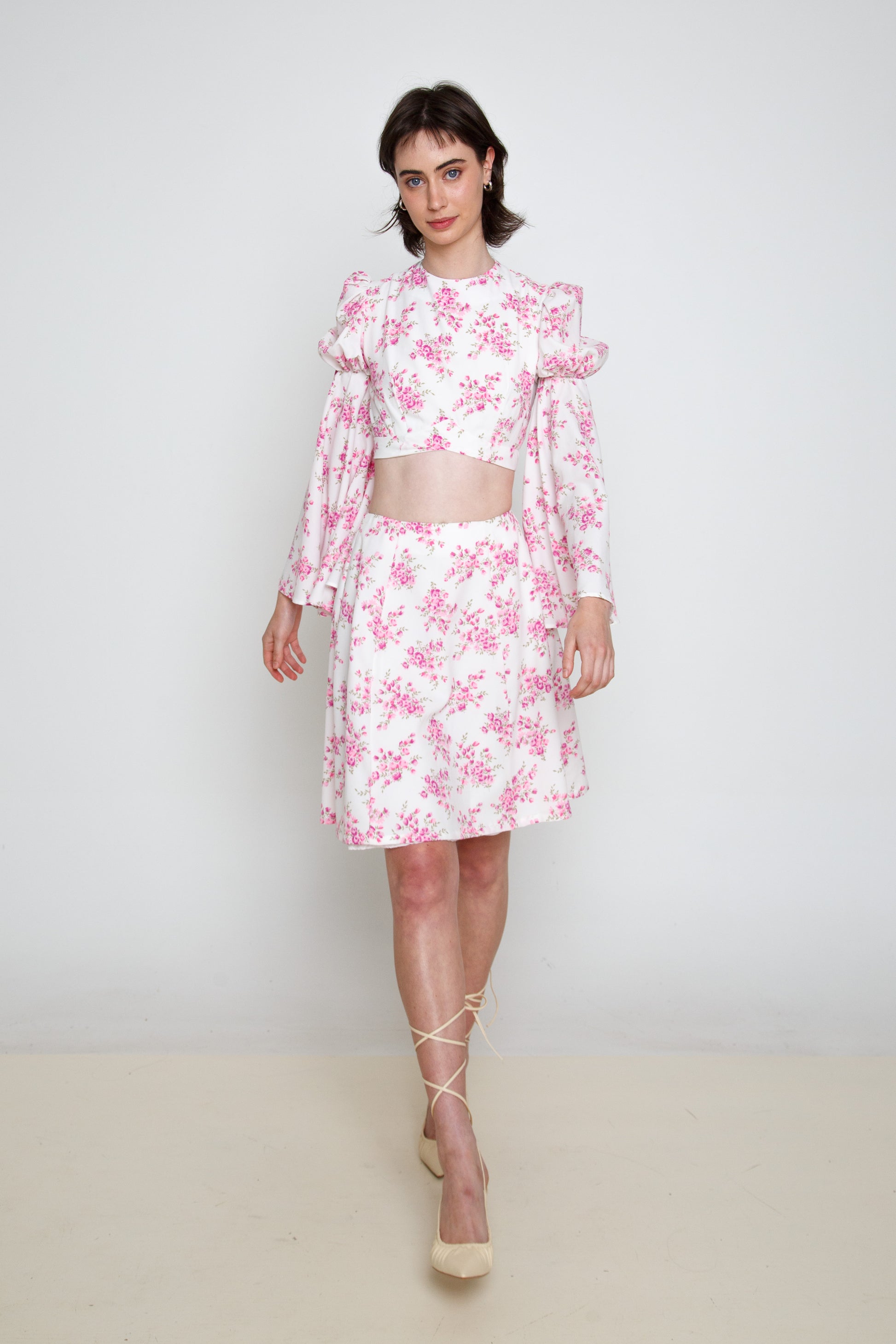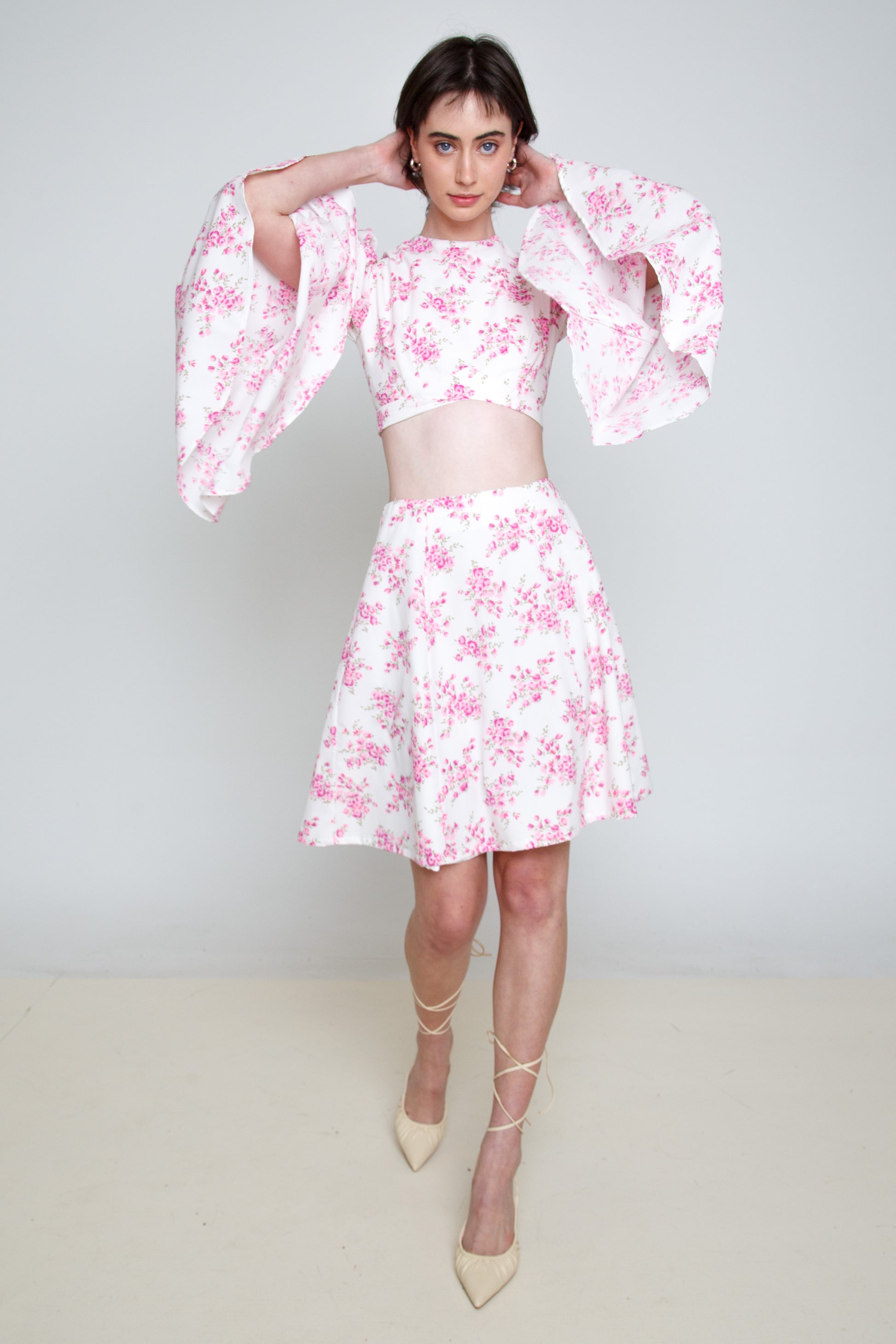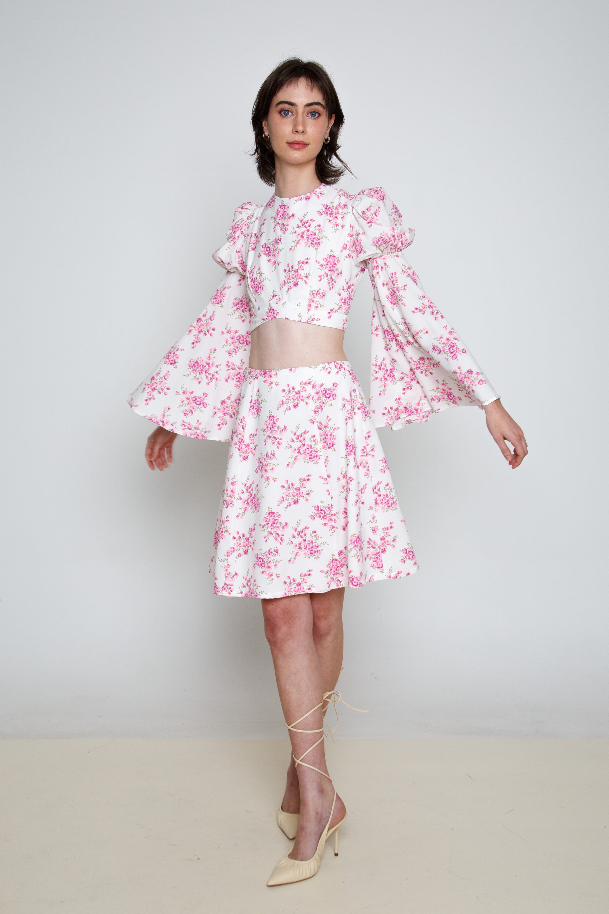 A one off reworked vintage set featuring an A-line mini skirt and a unique cropped belle sleeve top. This set is truly one of a kind.