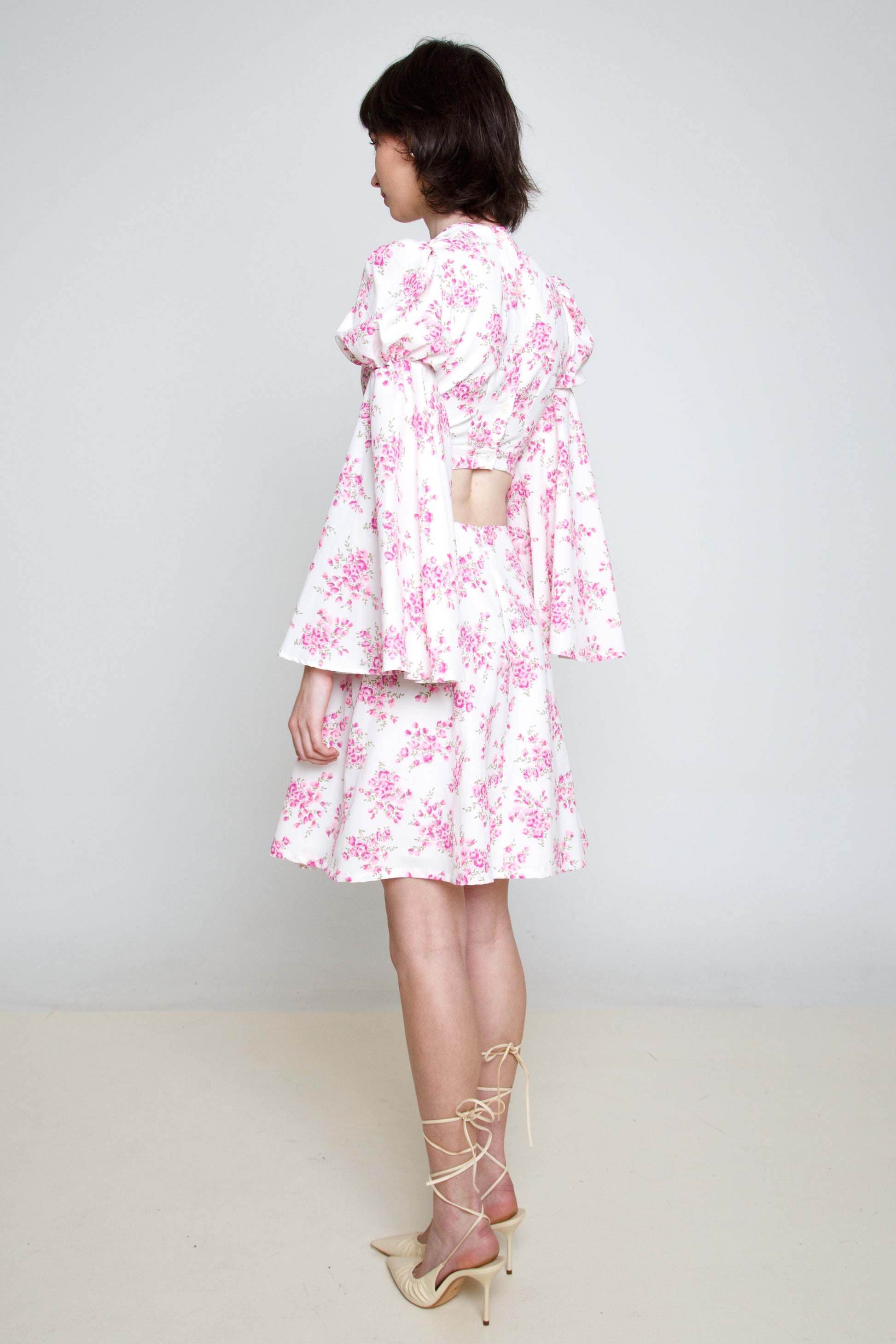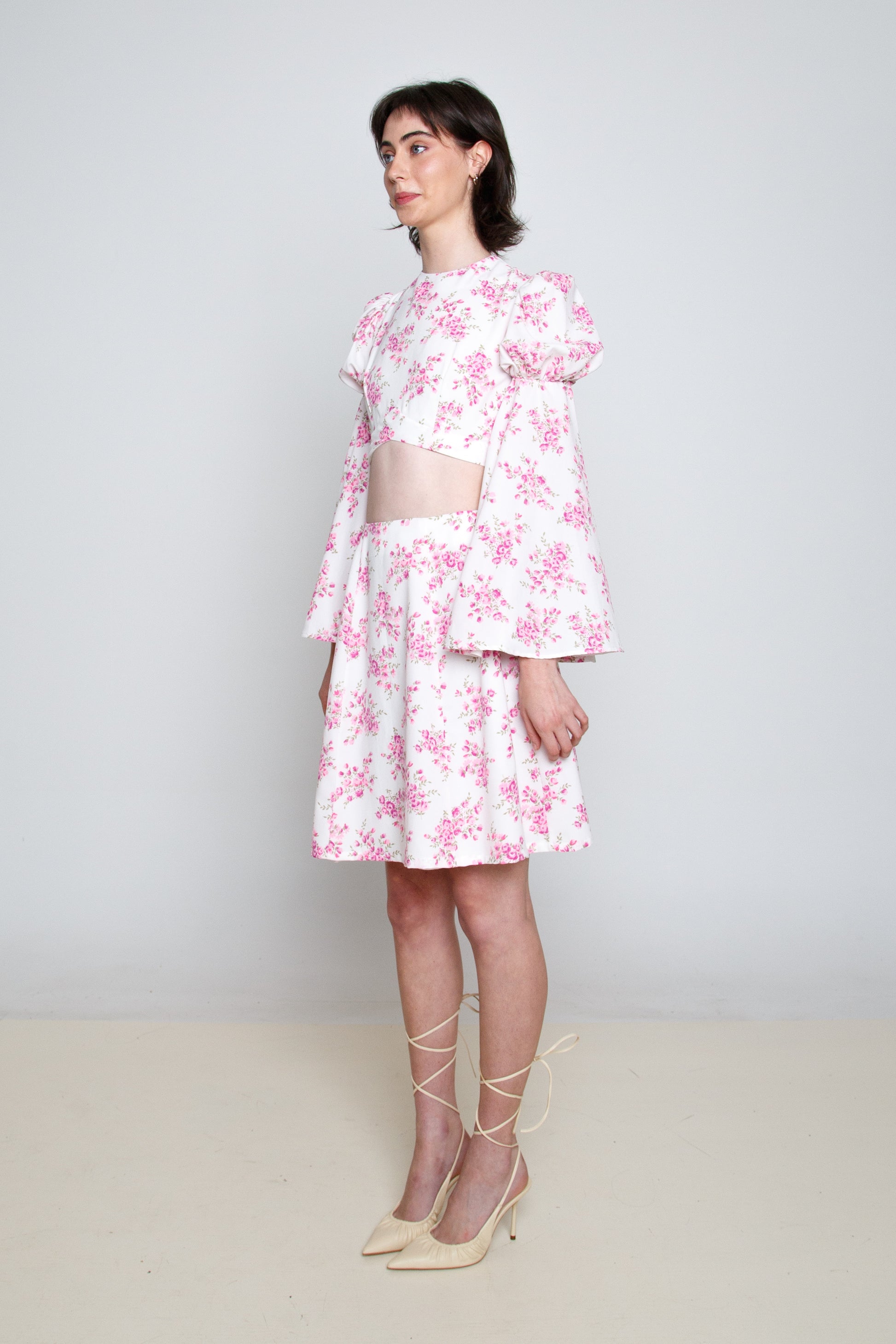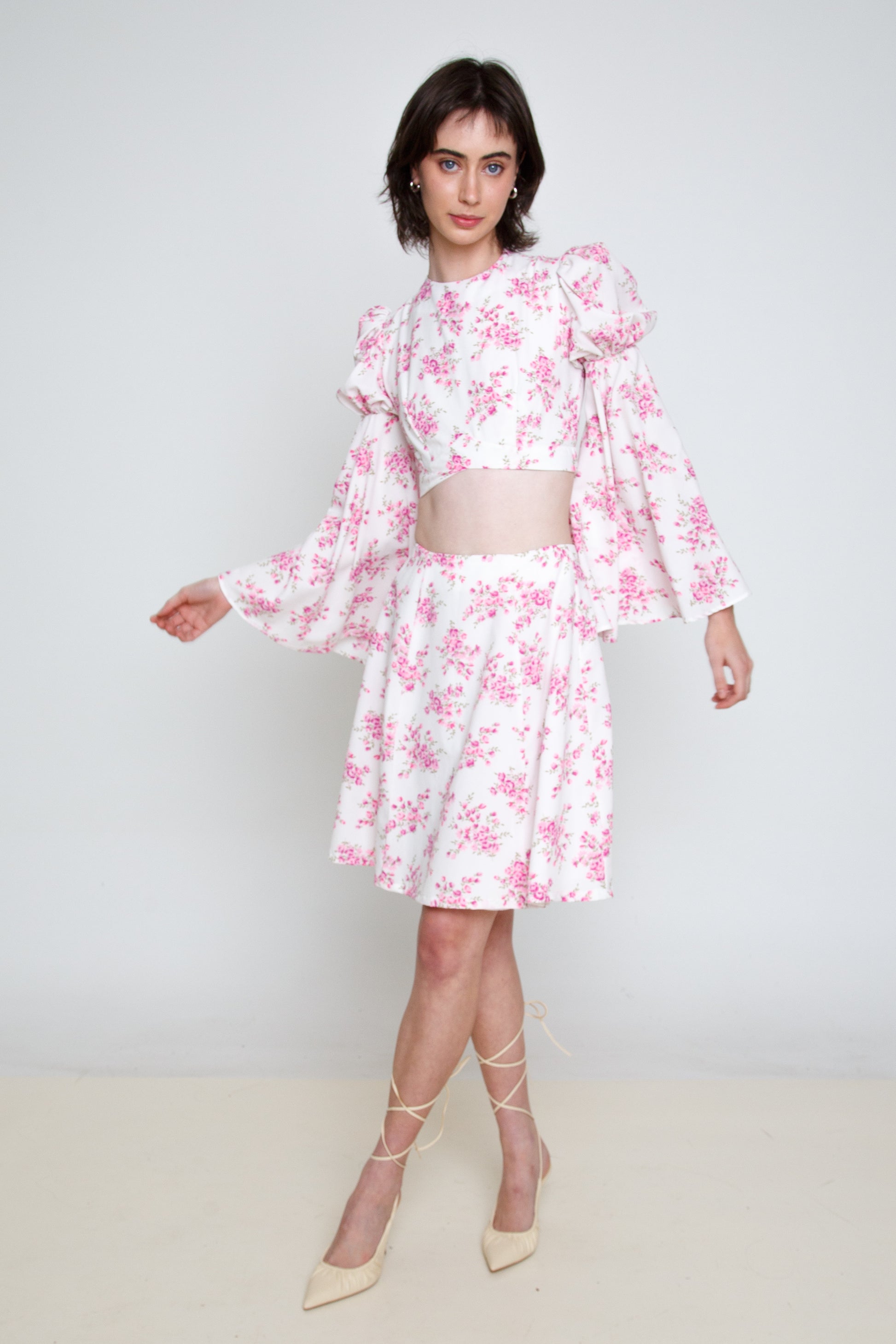 A one off reworked vintage set featuring an A-line mini skirt and a unique cropped belle sleeve top. This set is truly one of a kind.