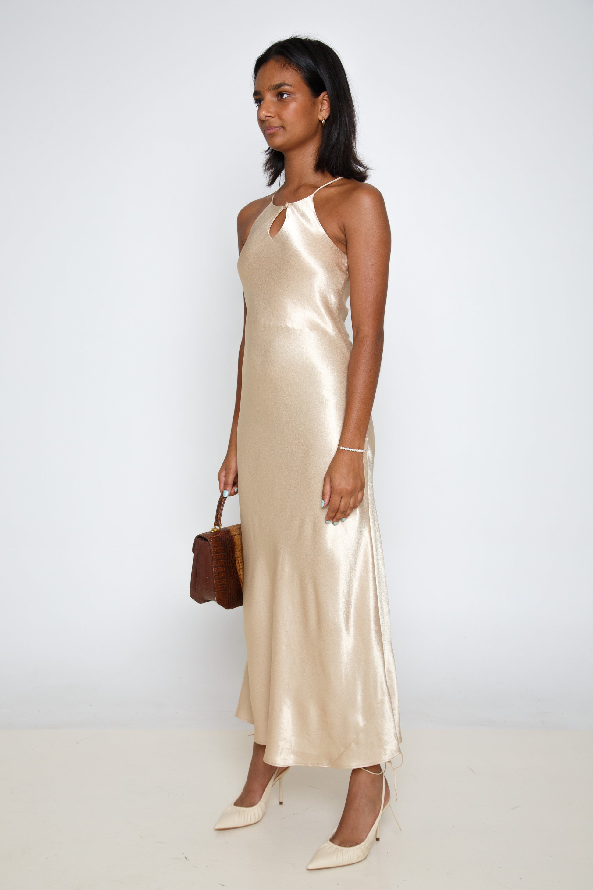 Timeless champagne magic. High neck, keyhole detail, cut on the bias and drapes so beautifully.