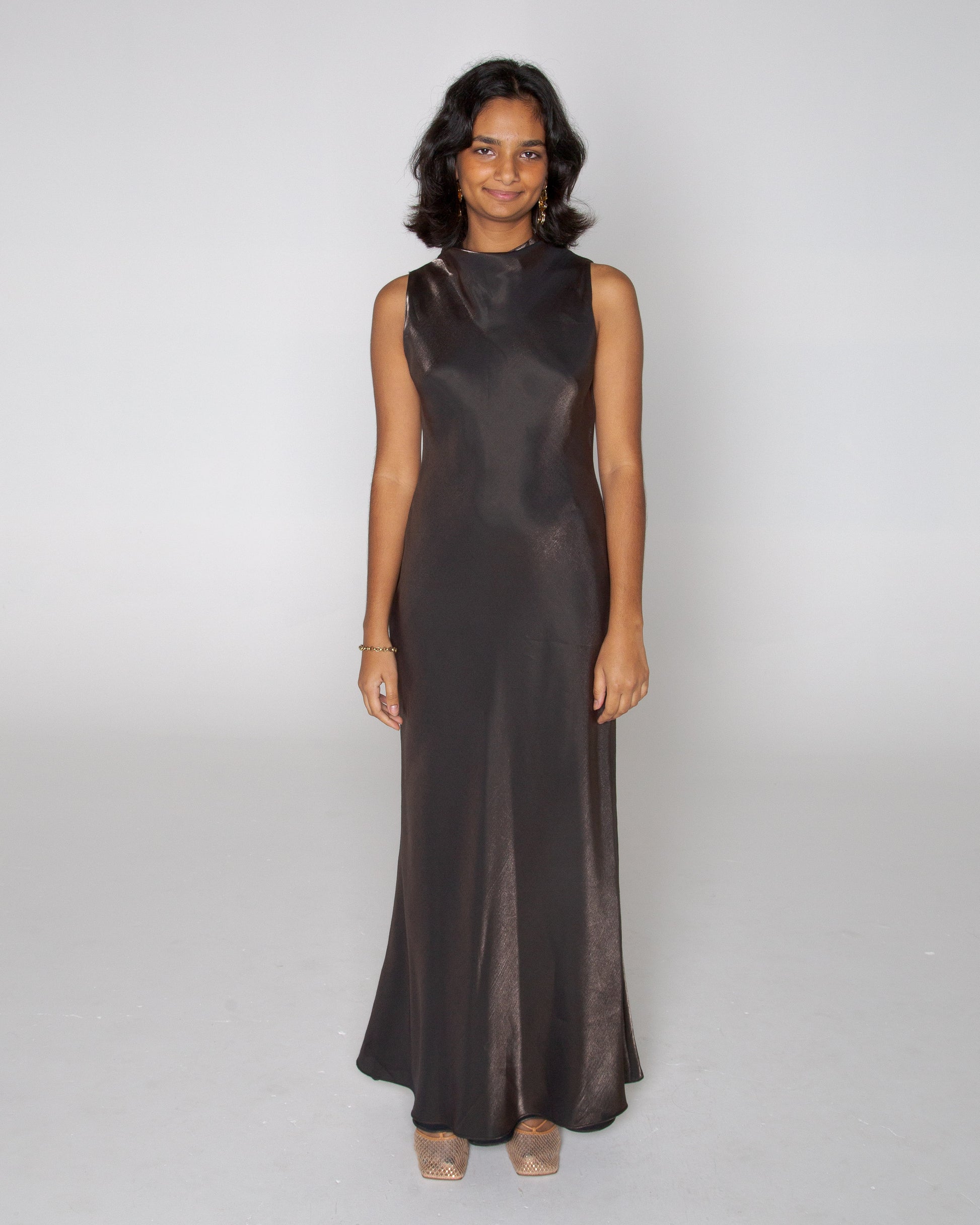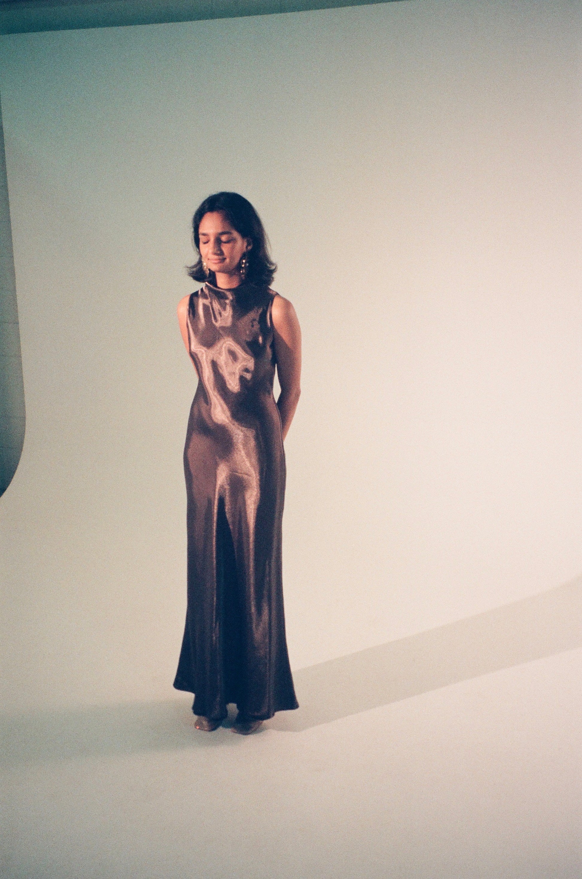 Such a unique 90s gem by Iconic American designer Jessica McClintock. High neck, bias cut in a divine shimmery bronze colour. This piece is suitable for size 8, 10, 12.
