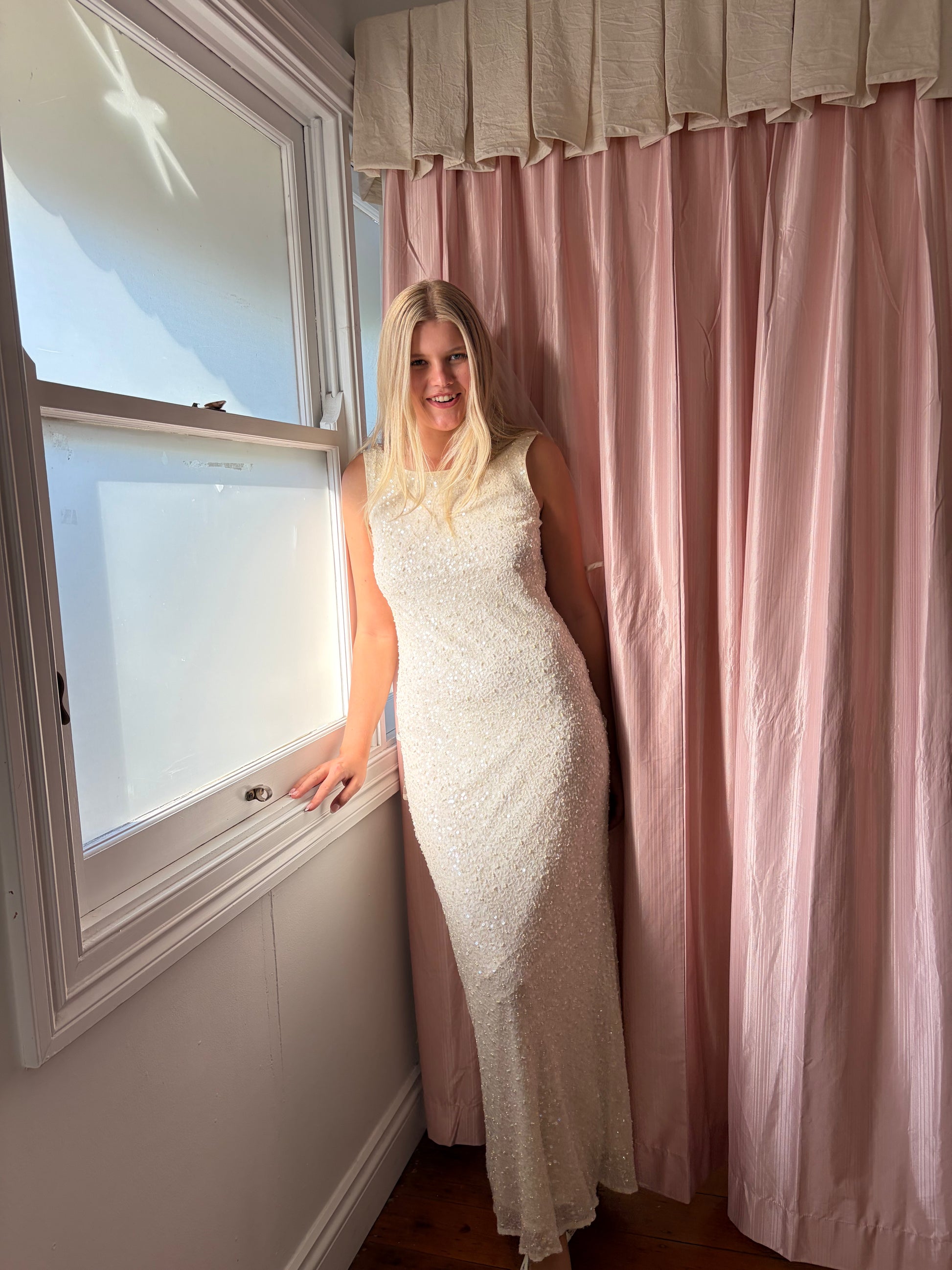 Vintage 90s silk beaded high neck gown with low back