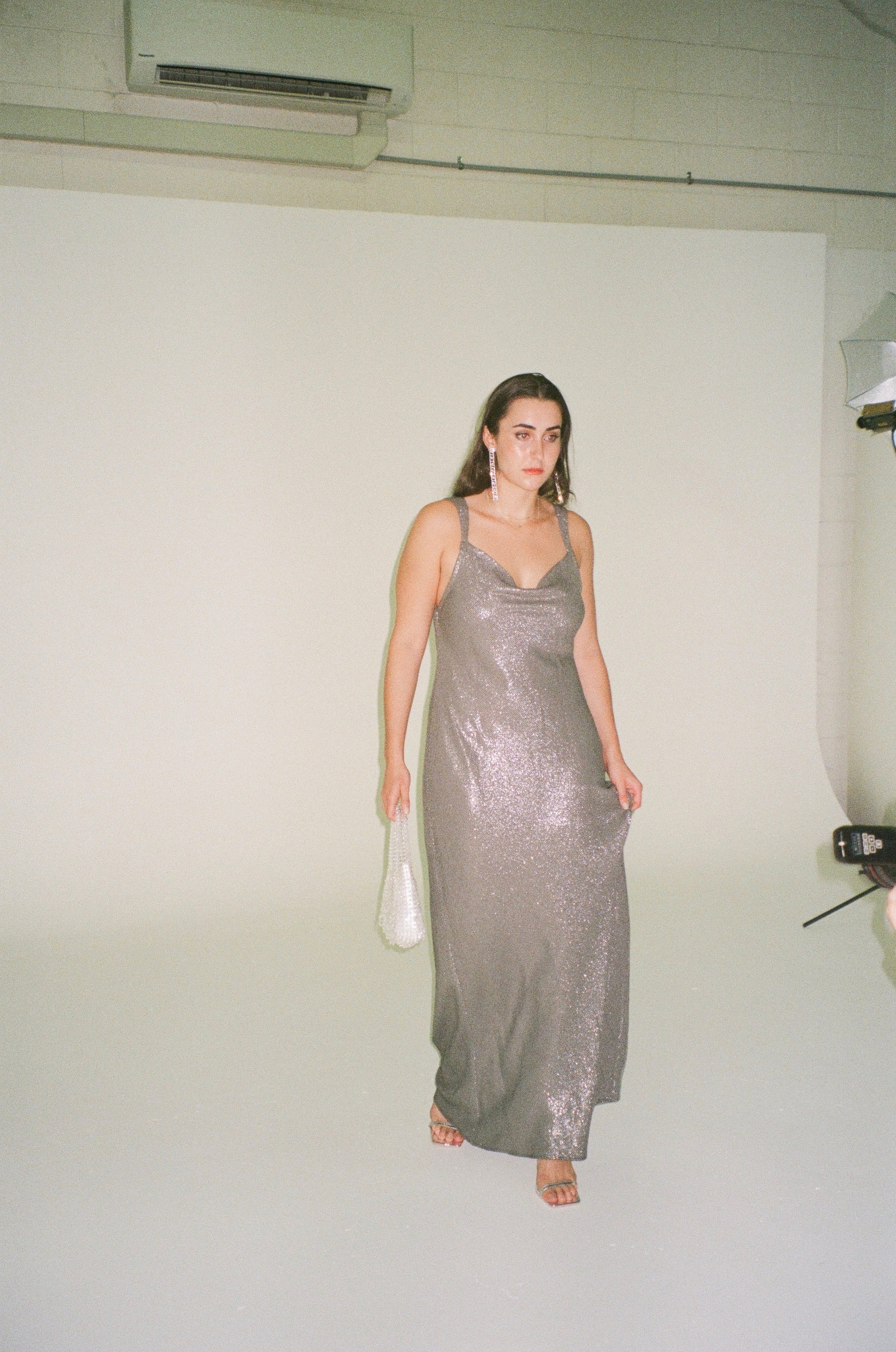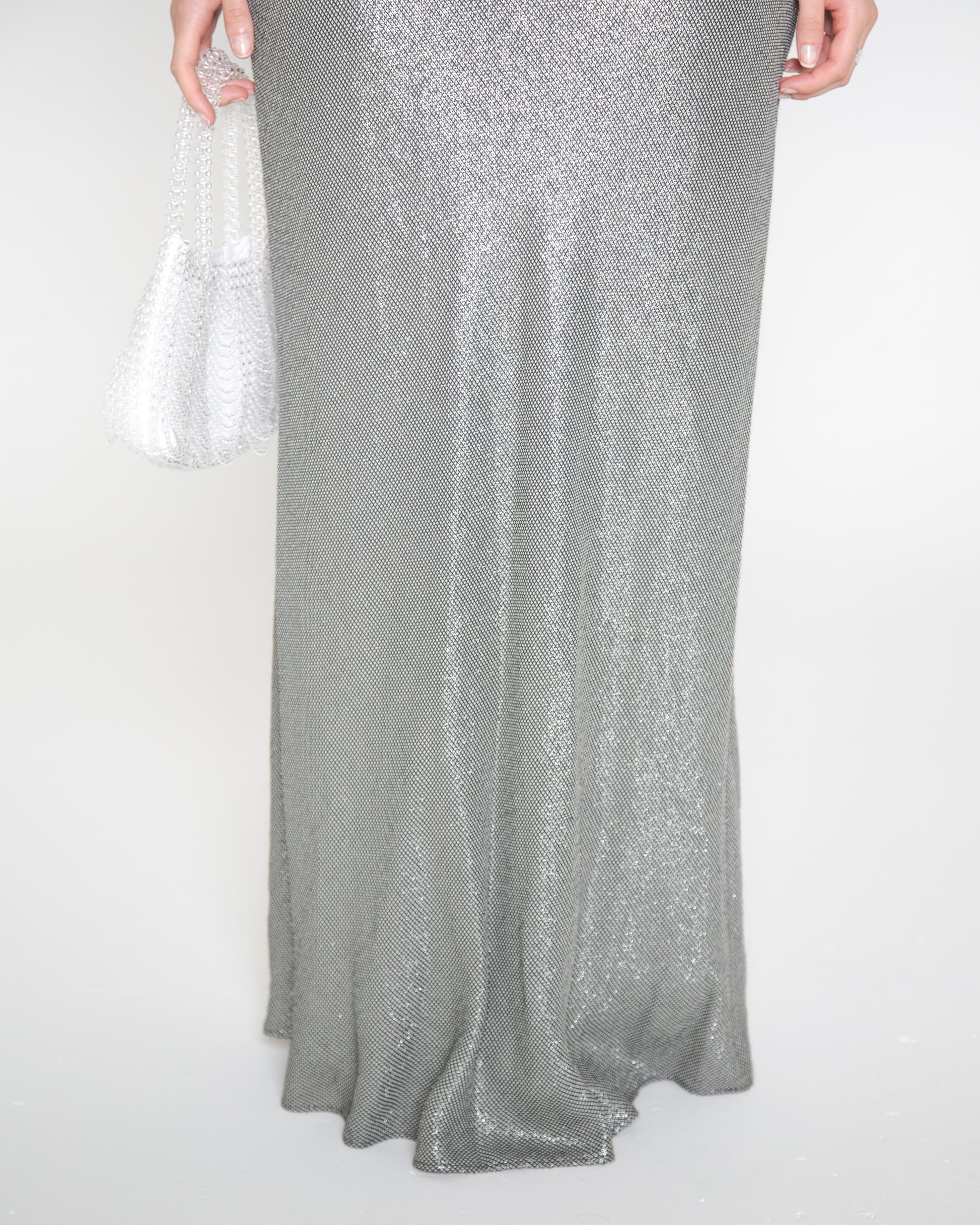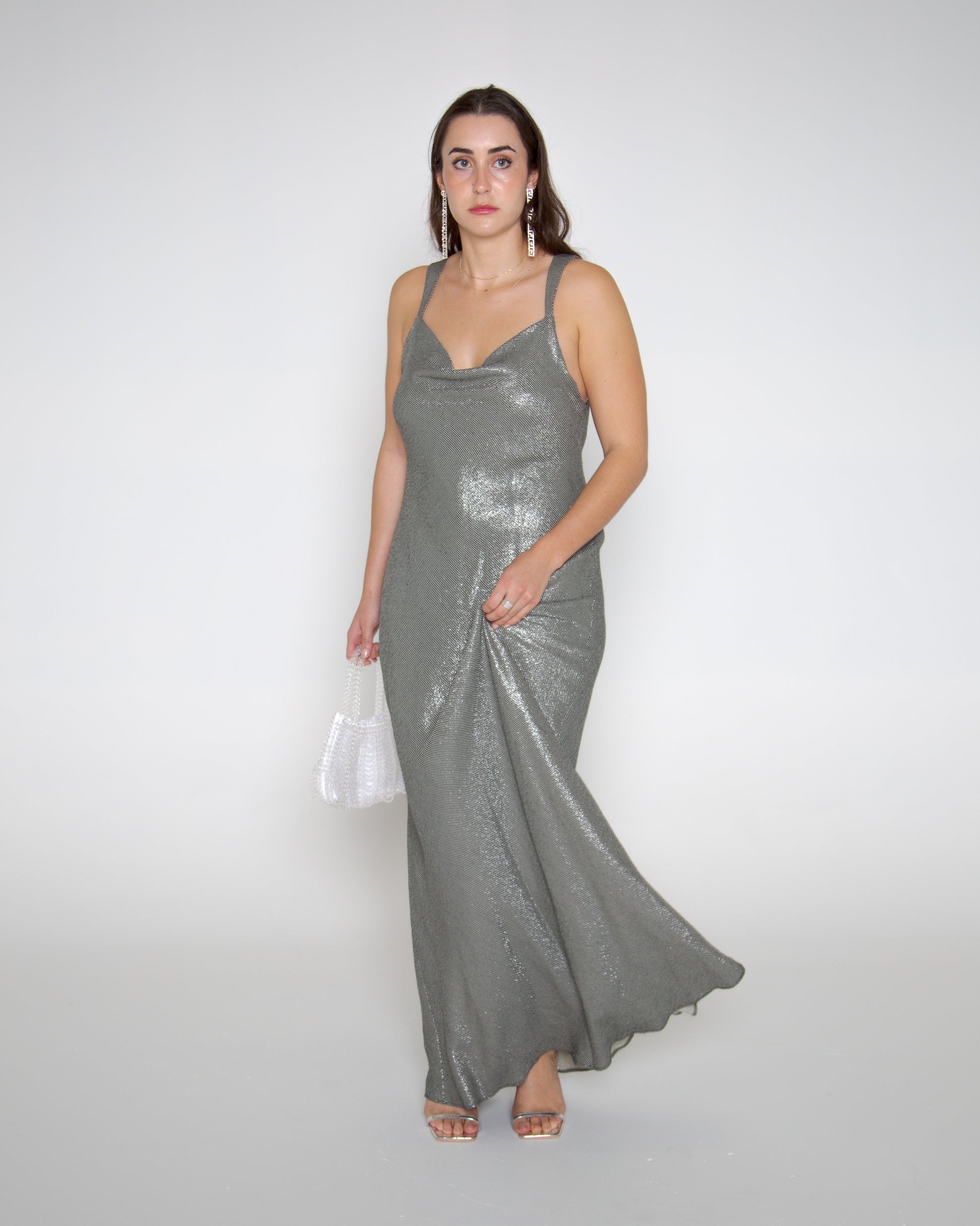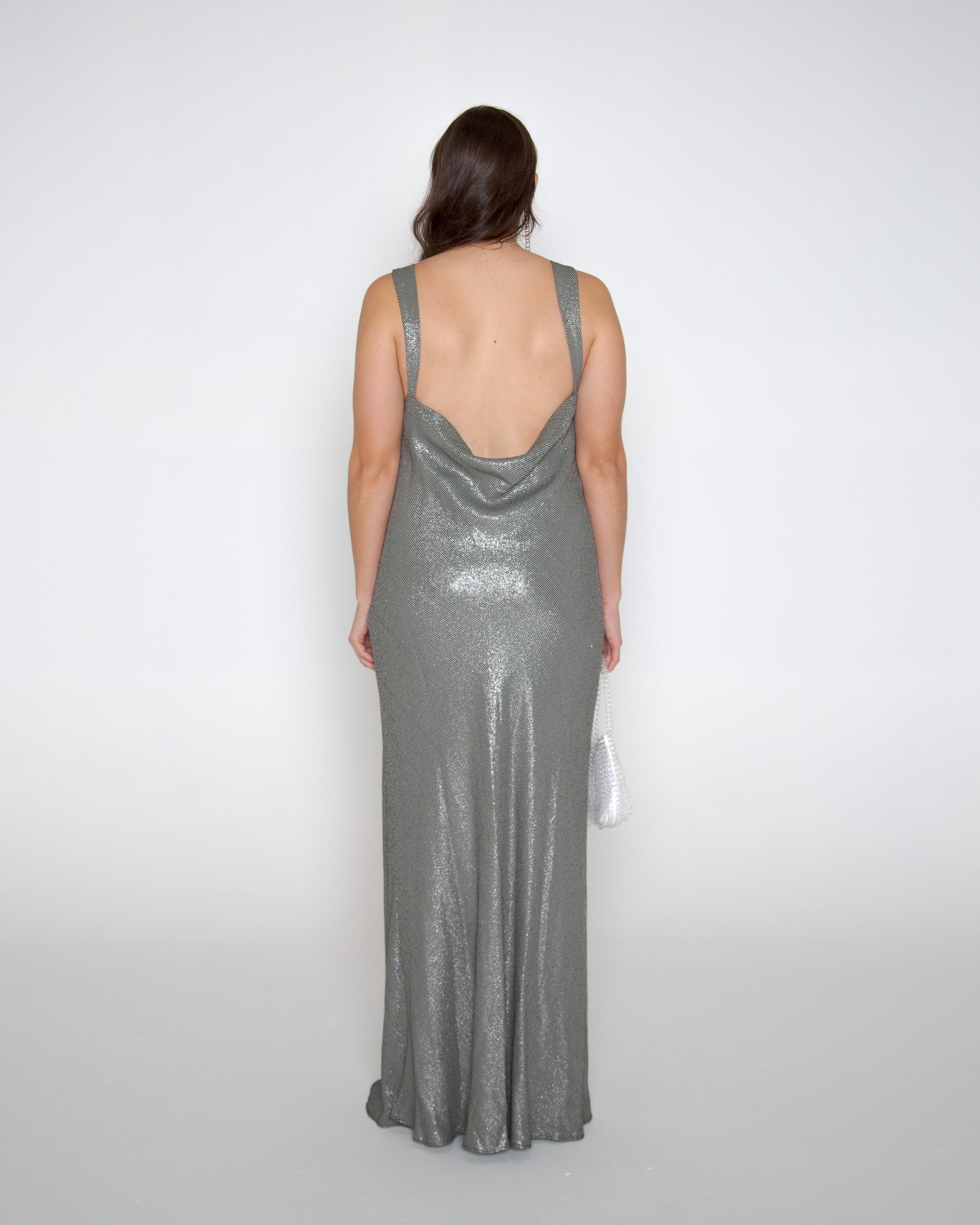 An original 90s Carla Zampatti gown. Shimmery silver glamour, cut on the bias, cowl neck with dreamy low open back. What's not to love! This piece is suitable for size 12, 14.